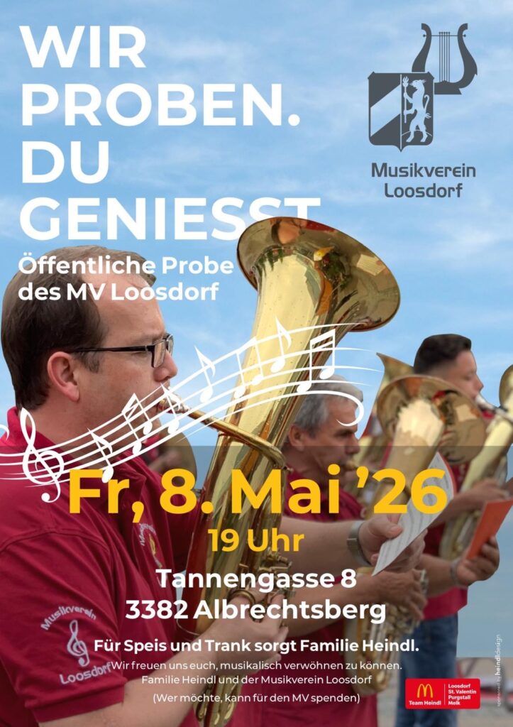 Hallo! Wir freuen uns auf eine öffentliche Probe in Albrechtsberg, Tannengasse 8 am  Freitag, 8. Mai 26 ab 19:00 Uhr Schau vorbei und lass die musikalisch verwöhnen!  Für Speis und …